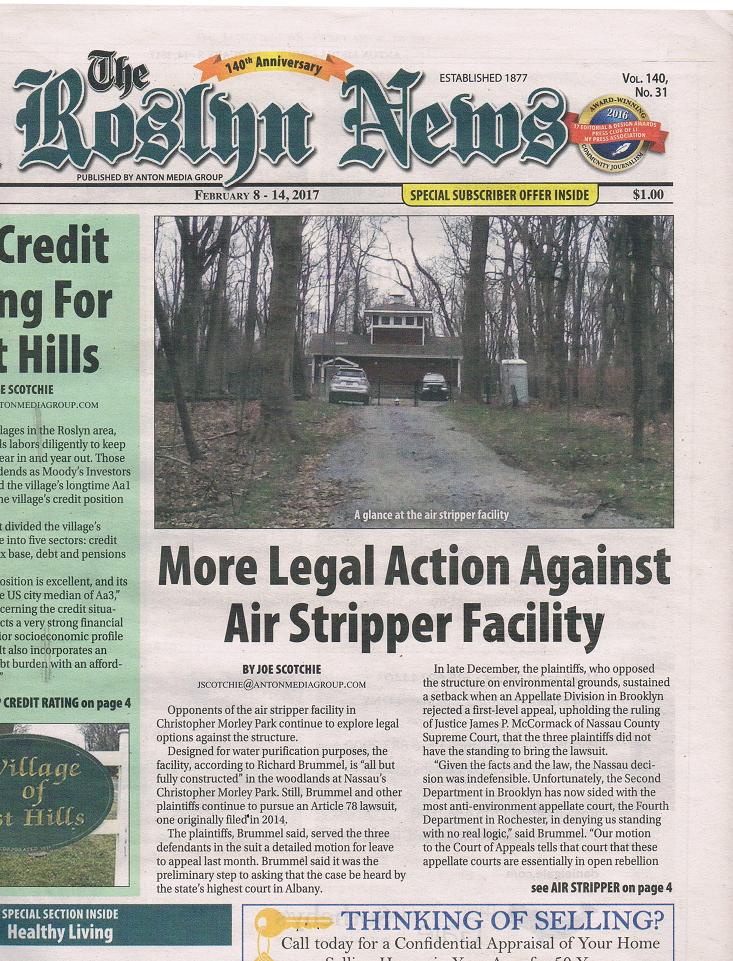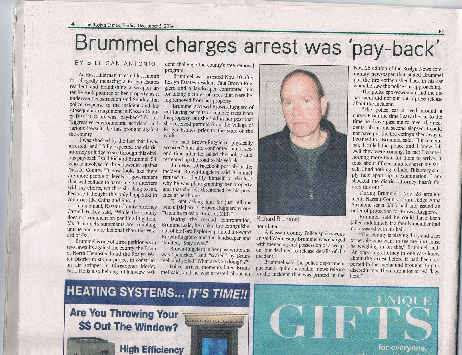 2016-17 Winter Updates    We continue to challenge the failure of local village, town, county and special-district governments (including water districts and fire districts) -- and the courts -- to enforce environmental rules and act pursuant to legal precedent. We have taken the necessary steps to appeal various cases, and we continue to expose what is demonstrably a "rigged", corrupt systemfavoring property, developers, and money, as opposed to Nature, existing residents, and laws as written and designed to protect Nature and our planet. At the same time, we work to mobilize the public and educate the media. (For example here). Even as we fail in the face of that corrupted process, we at least uncover and reveal the state of the 'reality', and help mark a pathway for change and future work.     We recently finished an important request-to-appeal to the New York State's highest court regarding our unsuccessful effort, in arm's length collaboration with the Sierra Club and Green Party, to protect the small public forest of Christopher Morley Park in Manhasset/North Hills (see below). We just received some welcome local coverage. As this case proceeds at some point we may investigate approaching the federal courts on �due process� grounds, where the state courts have proven so inhospitable and unreliable, because due process cannot occur when the courts are fundamentally broken.     As detailed below, in East Hills, both the Supreme Court and the Appellate Division ruled against us -- twice -- and permitted extensive tree destruction to proceed, despite deeply flawed approvals by the East Hills Architectural Review [and 'Tree Protection'] Board (�ARB�).     Regarding Christopher Morley Park, the �air-stripper� has been built despite our lawsuit showing in exhaustive detail how the environmental review was a fiasco by the Town of North Hempstead and others. On December 21, 2016, the Appellate Division dismissed our highly compelling appeal. But are persisting: on February 3rd, two of the original three plaintiffs filed our "Motion for Leave to Appeal" and we are hopeful the Court of Appeals will see the clear danger of letting the Appellate decision stand, as we argued.     Regarding "Country Pointe at Plainview", we continue to work with residents to stop further destruction of the remaining forest by the Town of Oyster Bay and the local soccer clubs. We also continue to strenuously oppose the injunctions imposed by Justice George R. Peck. We have just served an extensive motion seeking Justice Peck's removal from the case due to sensitive issues of impartiality and fairness. The motion was filed on January 19, 1017, and is available on-line at the NY court website under Index Number "600968/2014" (Nassau County).     Regarding the Holley (N.Y.) Fire Company's Squirrel Killing Contest, the appellate court in Rochester sided with the plaintiff we helped into court, and remanded the case to the local Supreme Court in Orleans County to re-visit the SEQRA environmental issues we finally presented to it in 2015 -- after three years of work up there, and three 600-mile round trip visits that winter. Now we have to make sure the pro bono attorneys whom we handed the case off to can effectively prosecute and win the next round -- prevailing on the merits, which will mean that the proliferating hunting "contests" nationwide require "environmental reviews" due to their potential adverse impacts on Nature. We are closely involved. We are also looking at the next trip up there to show the oppoosition to any hunt that does occur without the environmental review. We recently were informed that another fire department in Sodus, N.Y. -- about 60 miles away -- also has a squirrel killing contest in February, which amplifies the adverse impact regionally (because the hunters are likely to be using the same woods and fields). That is important -- and unfortunate-- and means our legal premise is that much more compelling.     Defamation/Libel Action Against East Hills and "Roslyn Times" We also have an appeal pending of an outrageously flawed "dismissal" of a defamation/libel action we filed in 2014 against the Mayor of East Hills and a local newspaper, "The Roslyn Times" over some very damaging and false statements published about activist Richard Brummel which both parties repeatedly refused to retract and correct at the time. Our appeal was filed last April, and we are still awaiting oral arguments.     Overall, we have been very pressed with Article 78 lawsuits, appellate motions for injunctions, a motion to the Court of Appeals, and a massive motion (and detailed "reply") to have the judge in the "Country Pointe at Plainview" litigation -- and the Oyster Bay injunction -- recused or removed.     Anyone wishing any specific legal paper can contact Richard Brummel at rxbrummel AT gmail DOT com or (516) 238-1646. We also welcome help and donations to give us money and time to do this arduous work, instead of 'real work'. We'll post a crowd-funding link shortly. Thank you -- Richard Brummel. DetailsEast Hills: At the N.Y.S. Supreme Court (Nassau County), Justice Roy Mahon and Justice Sondra Pardes separately vacated two injunctions against East Hills on October 6, 2016 and November 14, 2016, respectively. (Of the two, only Justice Mahon vacated his own TRO. Justice Pardes vacated Justice Steinman's.) The Appellate Division in Brooklyn then denied our emergency applications October 13, 2016 and November 25th, 2016, respectively, asking htem to prevent the tree-destruction from proceeding. In the frist case, an appellate judge literally compelled us to give the other side "notice", and the trees were cut henceforth. Significant losses to the East Hills environment ensued, which could very justifiably have been prevented if the justices -- or the Architectural Review Board -- had followed the facts and the law more conscientiously. In both cases the judges declined to rule on the 