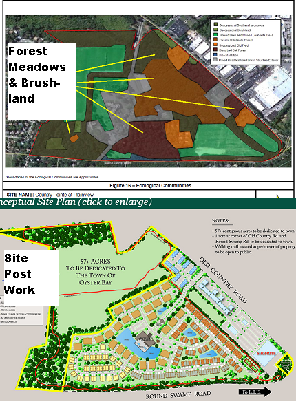 NEWS -- December, 2016"Country Pointe Plainview" Project: Save the Remaining 30 Acres of Forest Main Plainview Page    Status of the Huge LI Land-development Battle v. Town of Oyster Bay & Beechwood Properties: 143.25 Acres in Plainview-Old Bethpage: This summer, despite our strenuous year-long effort to testify, organize, publicize and litigate, bulldozers destroyed over 50 acres of forest and heavily-wooded former County hospital grounds in Plainview-Old Bethpage on the former Nassau County Office Complex there. Now, in late 2016, the battle is to save the last roughly thirty acres of forest **in their entirety** from plans by the Town of Oyster Bay to level them for new soccer fields -- as the Town has telegraphed its intention from the time they approved the project.