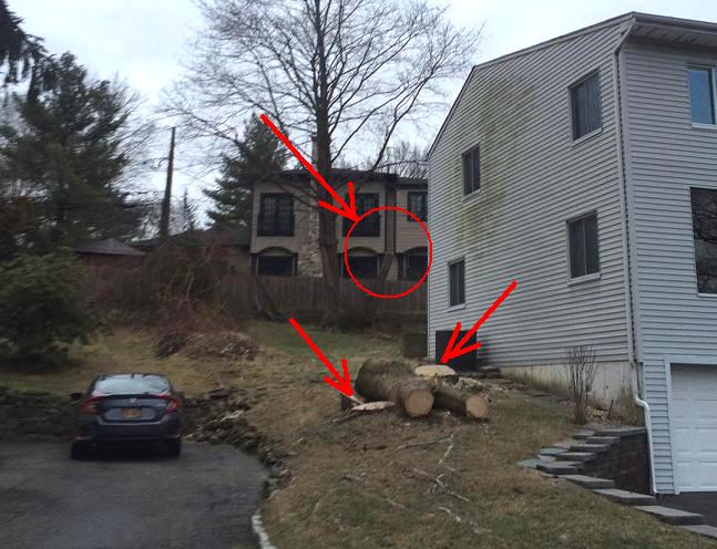 Two tree-stumps freshly cut and one cut trunk in the rear at One Wickham Rd., 1/23/19.     Thus once again the fecklessness epitomized by the East Hills political establishment and a growing portion of the residents appears to be on full display, with complete disregard for wildlife, the climate, and the intent of Village law.     (We are verifying by FOIL -- a process typically drawn-out unnecessarily to a full month by Village Clerk Donna Gooch -- exactly what the Village authorized.)     Inasmuch as the next-door neighbor said she never received a letter from the Village informing her of any proposed action next-door by the Architectural Review Board (ARB) it is a strong possibility this significant alteration of the local environment occurred simply by secret (non-publicized) fiat of the Village tree warden, as has been routine in the past. We filed a FOIL records-request 1/28/19 to see all the papers related to the shameful acts.     Nevertheless, it would be completely in character for the ARB to have approved such an unjustifiable, destructive act. That was routine practice under the guidance of Chairman Spencer Kanis: widespread deforestation, and monstrously-over-sized, often terribly-designed rebuilt new houses, for which we (and some other neighbors) repeatedly sued them, but unfortunately lost through judicial distortions of well-known NY environmental-law technicalities, like 'standing'.     We asked the unhappy next-door-neighbor to get involved, but so far we have not heard whether her spouse approved. Unfortunately, the present residents of East Hills are reluctant to fight for the environment, so this dismal situation continues, in East Hills, in 'greater Roslyn', and throughout Long Island and beyond.     Unreasonable fear of healthy trees, profiteering by unscrupulous companies, selfish desires for additional amenities, intractable local laws, weak zoning rules, dishonest expert opinions, and even builders' belief trees impede sales all conspire -- in the absence of competent regulatory oversight by the ARB and Village Board -- to destroy our essential ecological cornerstone, the mature trees eloquently recognized even in the Village code for their importance to the common good.