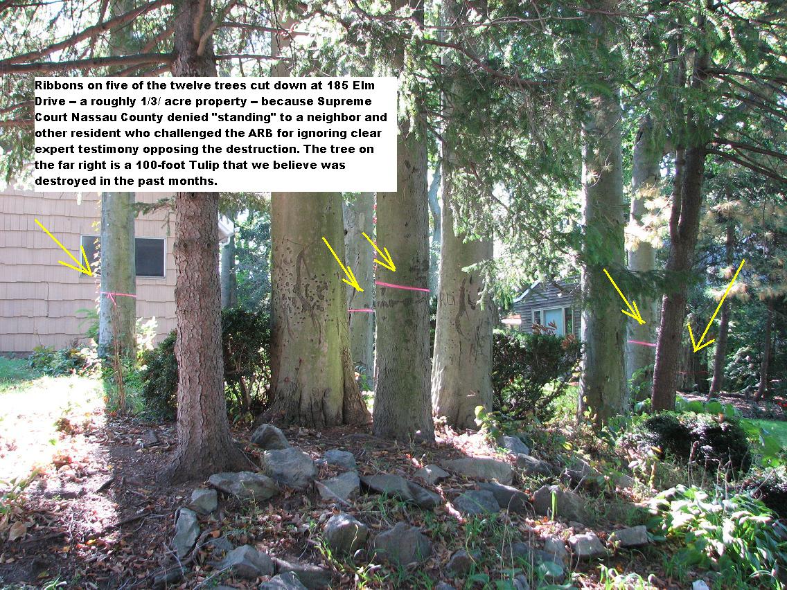 In August and October, 2016, we obtained two more temporary injunctions ("restraining orders") from two different justices in Supreme Court, Nassau County, to protect two Oak trees at 55 Oak Drive and eleven live trees -- including a massive Tulip, huge Oaks, a Pine and a stand of Beeches at 185 Elm Drive . The first injunction was vacated when the assigned-judge ruled we lacked 'standing' -- a finding at variance with the law -- and the appellate division then refused to act on our appeal motion until the other side had already begun cutting the trees in a gross dereliction by that Court, about which we are seeking redress. The second case is still in force after we held our ground in court last Mon, Oct. 17 in a knock-down drag-out verbal fight with the outside counsel for the Village of East Hills.     Read the Oak Drive Article 78 Petition' and Reply and the 185 Elm Drive Article 78 Petition. We showed in both cases the Architectural Review Board -- stacked with mayoral cronies appointed without public input -- failed to even look at the facts and the record before approving the farcical applications before it. To his credit, recently appointed ARB member Cliff Lewisohn alone opposed the first application in the final vote. But the second application was approved unanimously, despite opposition by arborists and us. The Oak trees at 55 Oak Dr. were allowed to be removed because the residents were afraid the acorns would injure their children and their cars. Res ipsa loquitur -- "The thing speaks for itself." Village of East Hills: ARCHITECTURAL REVIEW BOARD MEETINGS AND RECORDS