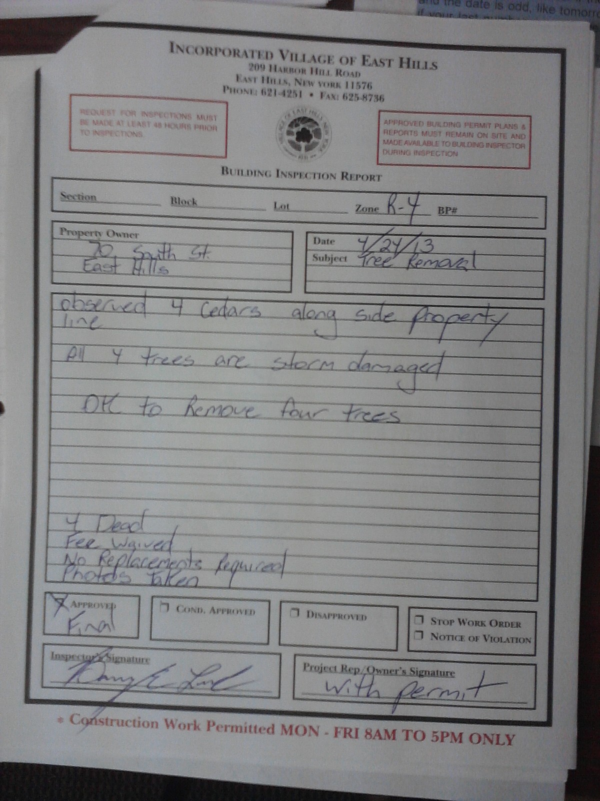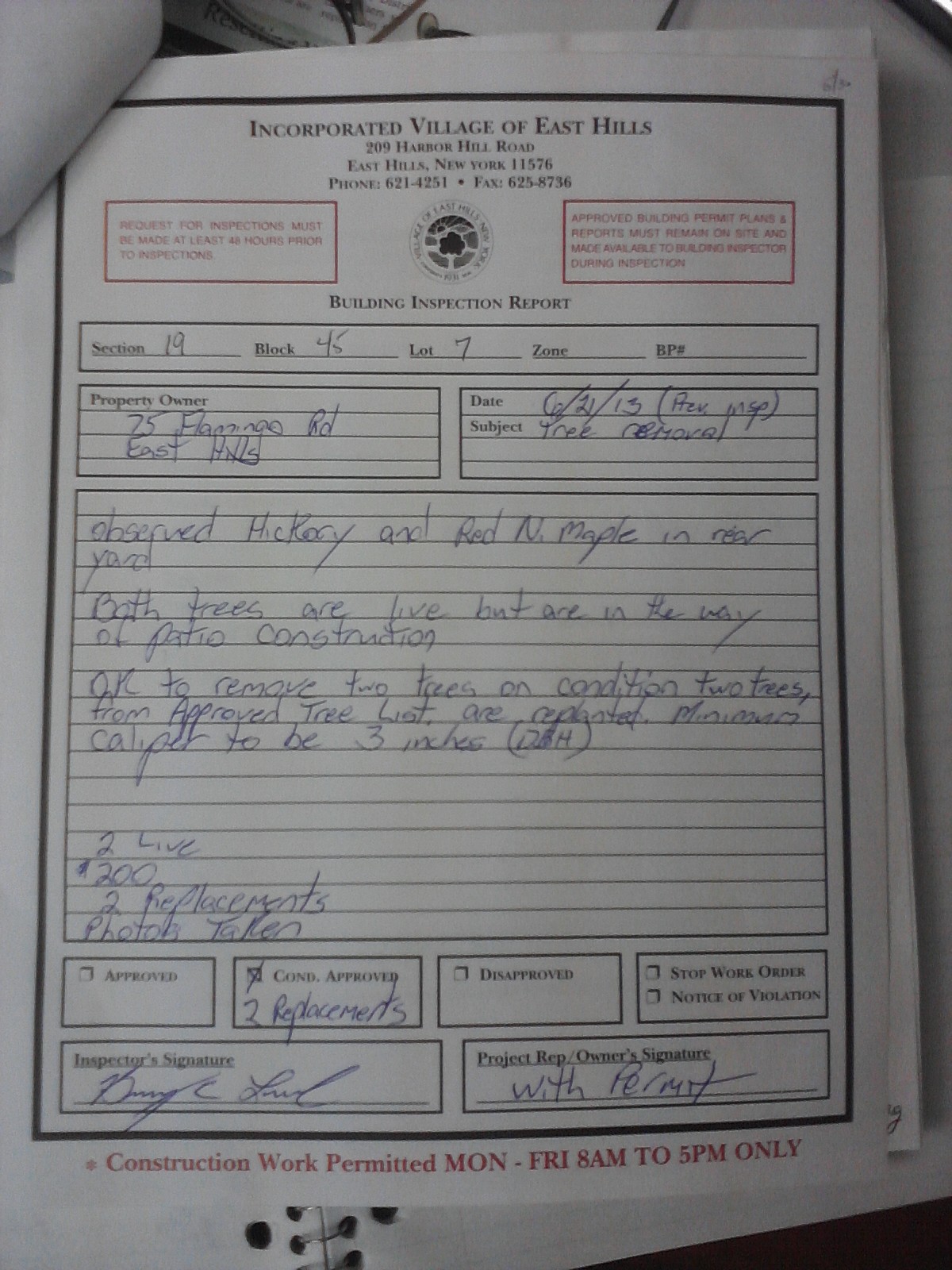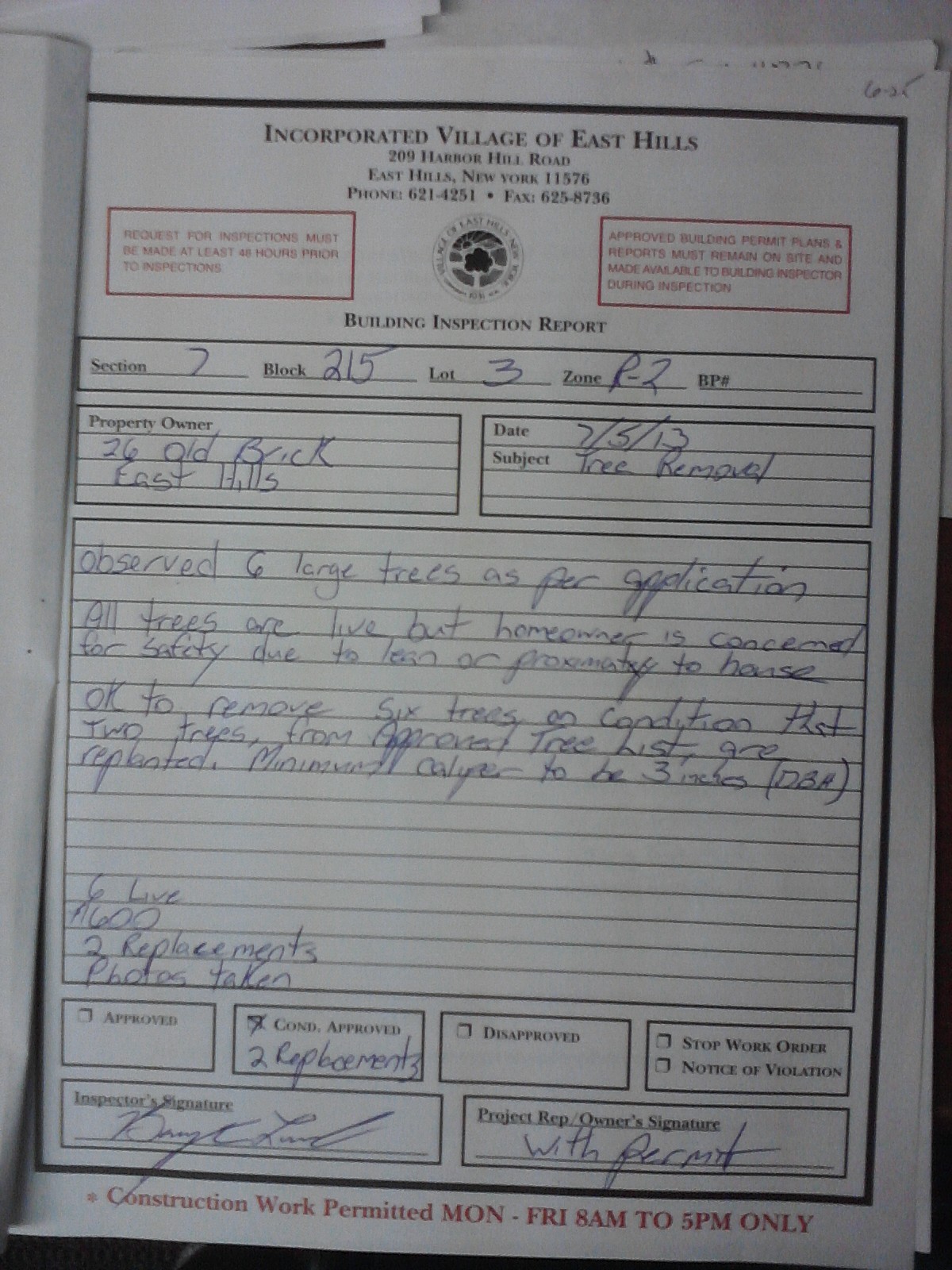 113 Revere Road, East Hills, NY (Fall 2016-Spring, 2017): Developer destroys tree after receiving 24-hours legal-notice of Court hearing.