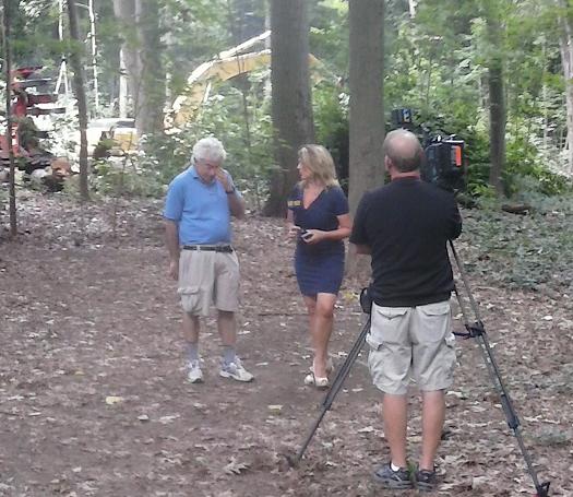 Plaintiff David Greengold with News-12 (LI) reporters at Christopher Morley Park on August 20, 2015 as chainsaws and bulldozers invade and vandalize the public forest. Neither the Nassau Boy Scouts who camp in the forest, nor the relevant governmental subdivisions, nor the NY courts stood up for the law (SEQRA) or Nature. It was left to a handful of citizens -- who keep fighting. |