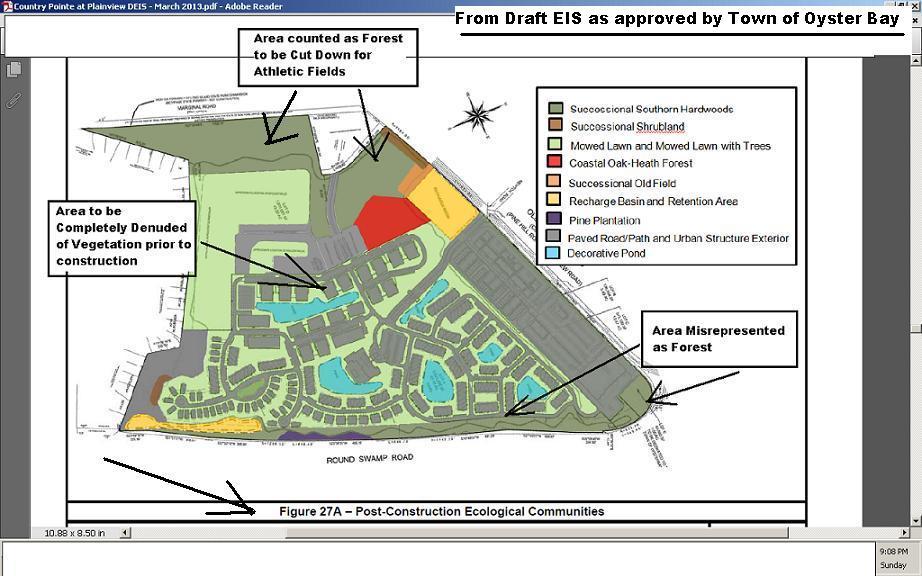 The 'open process' may provide a valuable opportunity, but we cannot forget the Town also performed a 'due process' in deciding to rubber-stamp the rest of the disastrous development now underway -- despite massive multi-year local opposition; therefore so we must take everything with a large 'grain of salt', and prepare for a big fight -- in public and in the courts. Further we must remember, the soccer leagues were repeatedly promised the land of these forests, and they are very powerful. Not only are they families, but the leaders are prominent citizens -- and probably more. In fact the SEQRA "Findings Statement" specifically anticipates construction of new fields, with the remaining forests being (1) the only remaining space to use; and (b) mapped out as athletic fields on the Town's approved site Plan (see below for both documents).