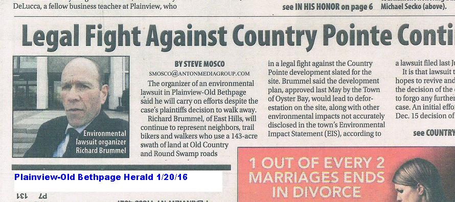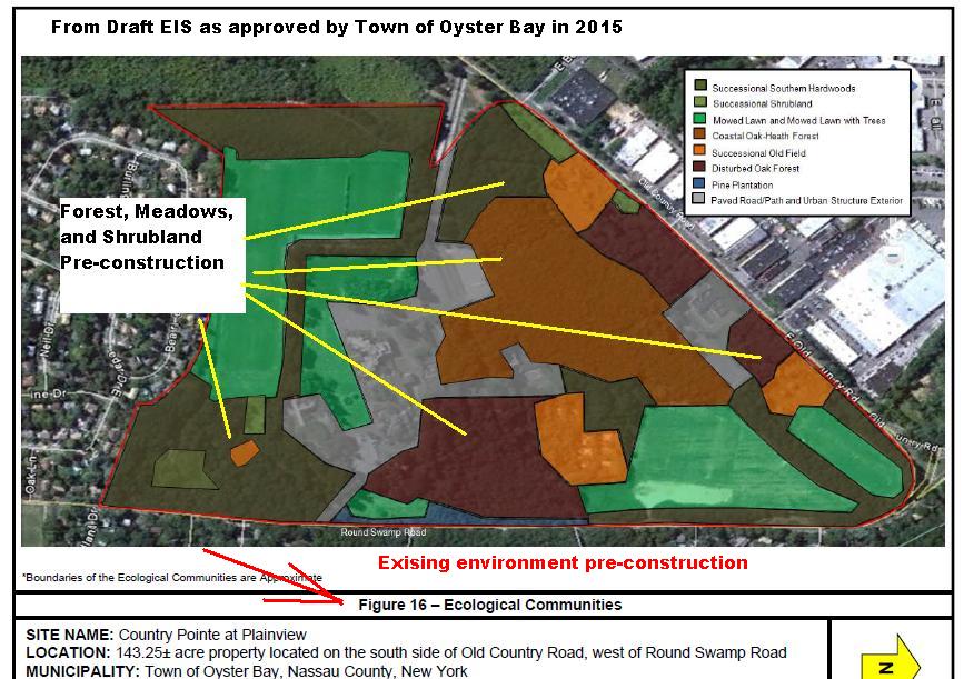 Among other points raised by the Town attorneys and an environmental official whom Supervisor John Venditto directed us to speak with after the last Town Board meeting: the developer and Town agencies responsible to land-clearing and tree-destruction permits have been told to preserve the forest until the Town determines its plans; furthermore, Councilwoman Rebecca Alesia is the point-person for the Town-lands at Country Pointe Plainview; a public meeting will be held after the summer to hear points of view; and finally the land has not yet been transferred to Town ownership even a year after the 'covenant' foreseeing its transfer was approved by the Town -- on May 12, 2015.