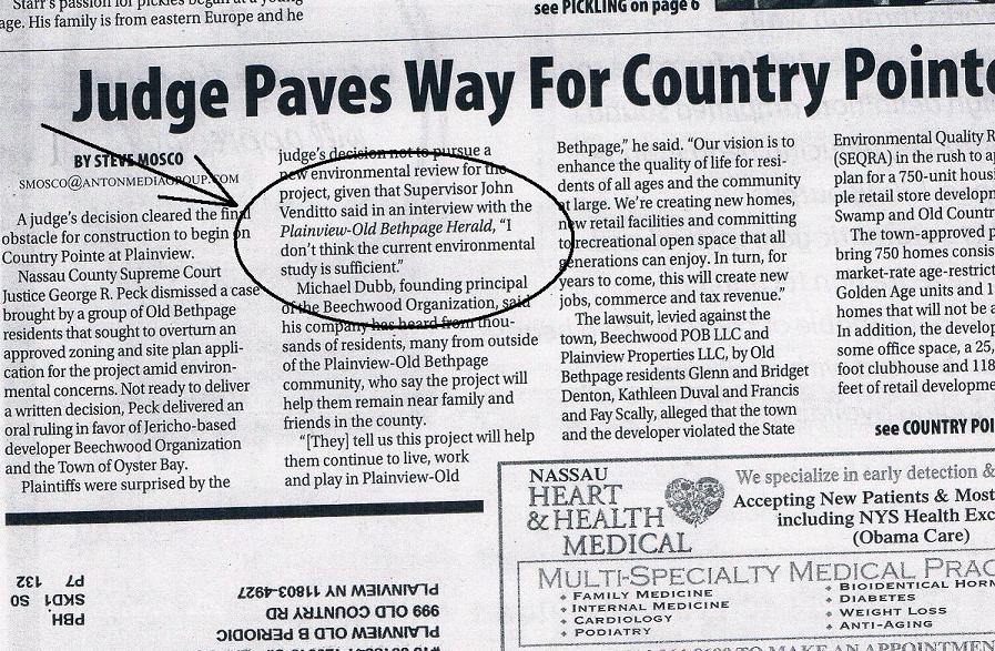 Justice George R. Peck's dismissal of the case -- prior to the efforts to intervene, appeal etc. (Dec. 2015). The Court inexcusably ruled that the Petitioners, who are *immediate neighbors* and *intensive users* of the CPP site, did not have 'legal standing' to sue. The Court ignored all precedent, as the plaintiffs documented repeatedly in the case. For example, the Court ruled the Petitioners failed to 'exhaust administrative remedies' etc. -- a doctrine repeatedly rejected for SEQRA lawsuits by appellate and other courts in other cases. The Nassau Court brushed away five air-tight affidavits establishing the Petitioners'standing. As to whether the Petitioners''had themselves individually raised the same arguments prior to their lawsuit -- a key issue in the Judge's Decision (later to be omitted from the 'settled judgement') -- the Petitioners thoroughly established that the question, argued by the Town and developer, was legally irrelevant, because among other reasons the same issues were indeed raised by other critics of the project, thus passing the test established in 2013 by the Second Department of the Appellate Division, the very same Court hearing the appeals, see Shepherd v. Maddaloni, 103 A.D.3d 901 (Second Dep't, 2013).