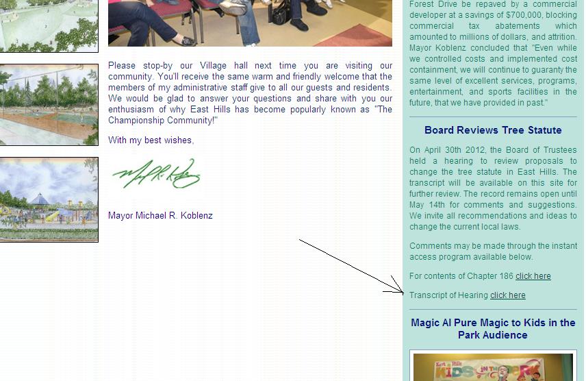 Link to surreptitiously altered transcript of East Hills tree-protection hearing (missing pages 18 through 34) as originally posted on village website Click Here. |