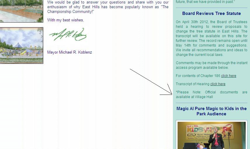The Doctored Official transcriptIn the early part of 2012, in the heat of a contested local election, the ruling group in the village of East Hills -- the Koblenz Team -- pretended (we can now conclude) to respond to citizen concerns about the environment by promising to consider a building-moratorium, to hold hearings, and to form a special committee to deal with frequent demolitions and large-scale rebuilding in the community, and the unexpectedly numerous removal of healthy mature trees, despite apparent laws intended to prevent both situations. The most consistent and high-profile critic was Richard Brummel (author of this website), a resident who grew up in East Hills and returned for an unexpectedly extended visit in 2010. He publicized his concerns in flyers and newspaper letters and articles, and testified in hearings the village scheduld to mollify concerned residents and to postpone any consideration of a moratorium on new construction. Our very sharp and detailed remarks at hearings in April and May were repeatedly interrupted and disputed by village officials during the hearings. But shockingly we discovered in June that our testimony had been completely removed surreptitiously from the official transcript of the April hearing on tree-protection as presented on front page of the village website -- along with comments by Republican opposition candidate Matt Weiss and those of a man who is an ally of Weiss's party, the East Hills Advocacy Group. Below are documents relating to that story. |