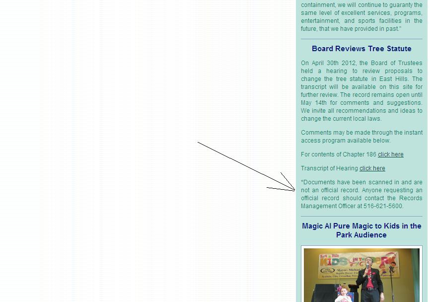 | Portion of East Hills homepage June 15,2012. Note first version of new, unexplained disclaimer. | ||