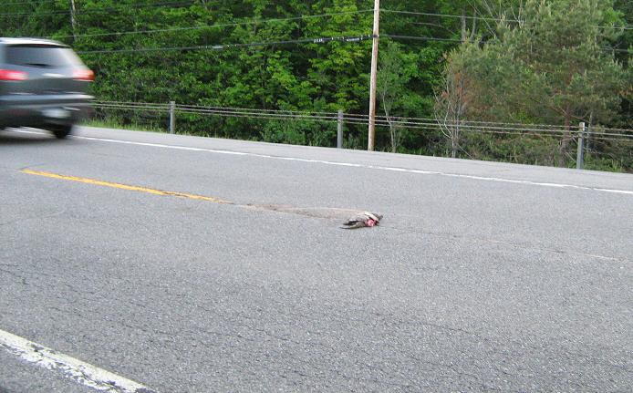 Photos of Roadkill in New York & Vermont (Long Island, Catskills, Adirondacks) Throughout 2011 Please HELP stop the slaughter: Always watch for animals when driving. Don't speed. Slow down in woodlands. Slow down at night. Demand better highway policing. Lobby for reforms outlined HERE. The animals and I Thank You! (Note: All animals pictured were moved to a sheltered peaceful place.) We received fortuitous help identifying the animals from a staff member of the Wildlife Conservation Society, Canada. Thanks. |