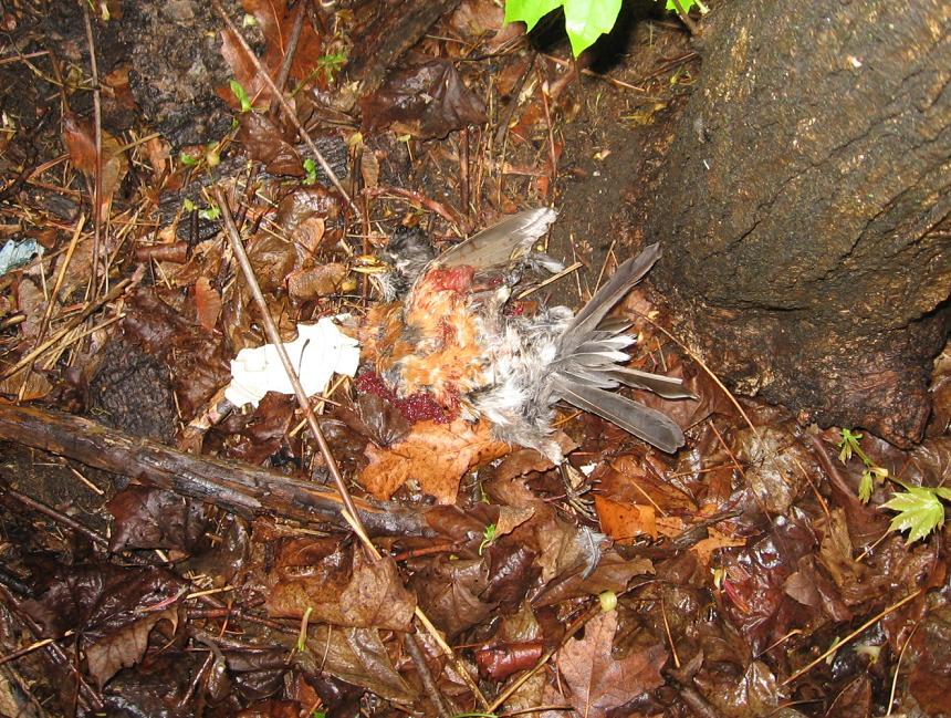 Robin killed in westbound LIE service Road, East Hills, May 2012, removed to base of tree. |