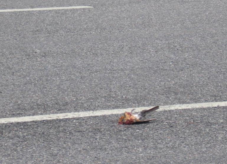 Robin killed on westbound LIE Service Road, East Hills, May 2012. (NOTE: Despite 30 mph posted speed, traffic routinely blasts through here at an estimated 50 mph, especially in the AM. |